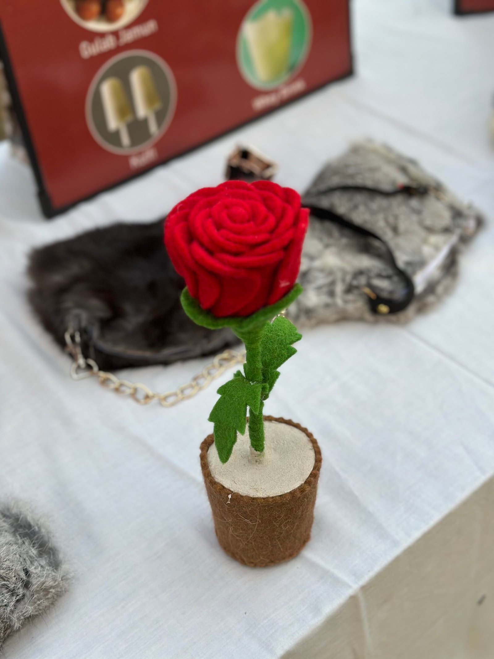 The Sustainable Wool-Based Single Rose Flower Handicraft is a handcrafted decorative piece made from indigenous sheep wool blends. Using a combination of machine-made felt and hand-assembly techniques, this single flower replicates the natural aesthetics, softness, and subtle aroma of a real rose. It is mounted on a Plaster of Paris (POP) base pot stand, ensuring stability and elegance for indoor décor.